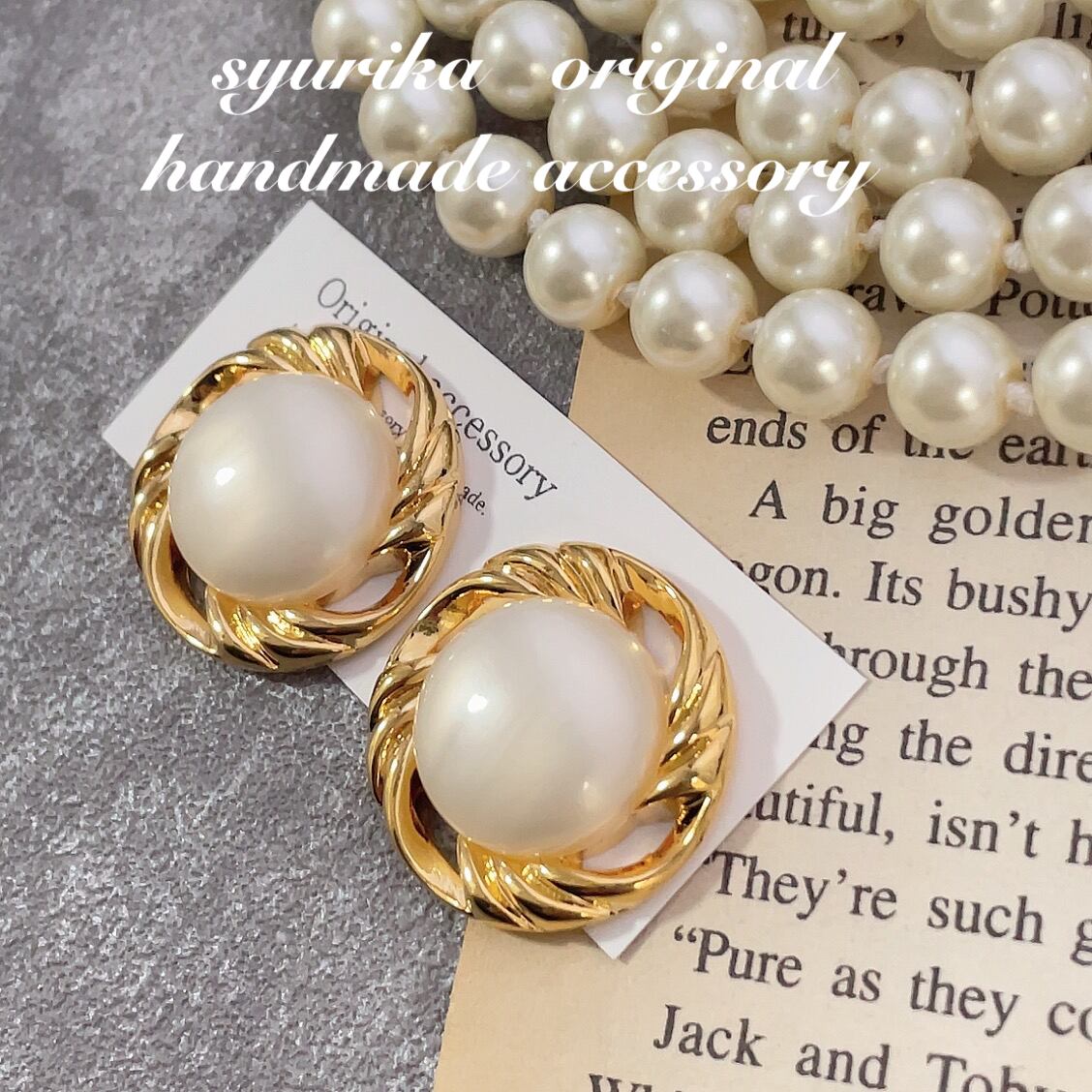 【#199】パール調×ゴールドボタン ピアス/イヤリング